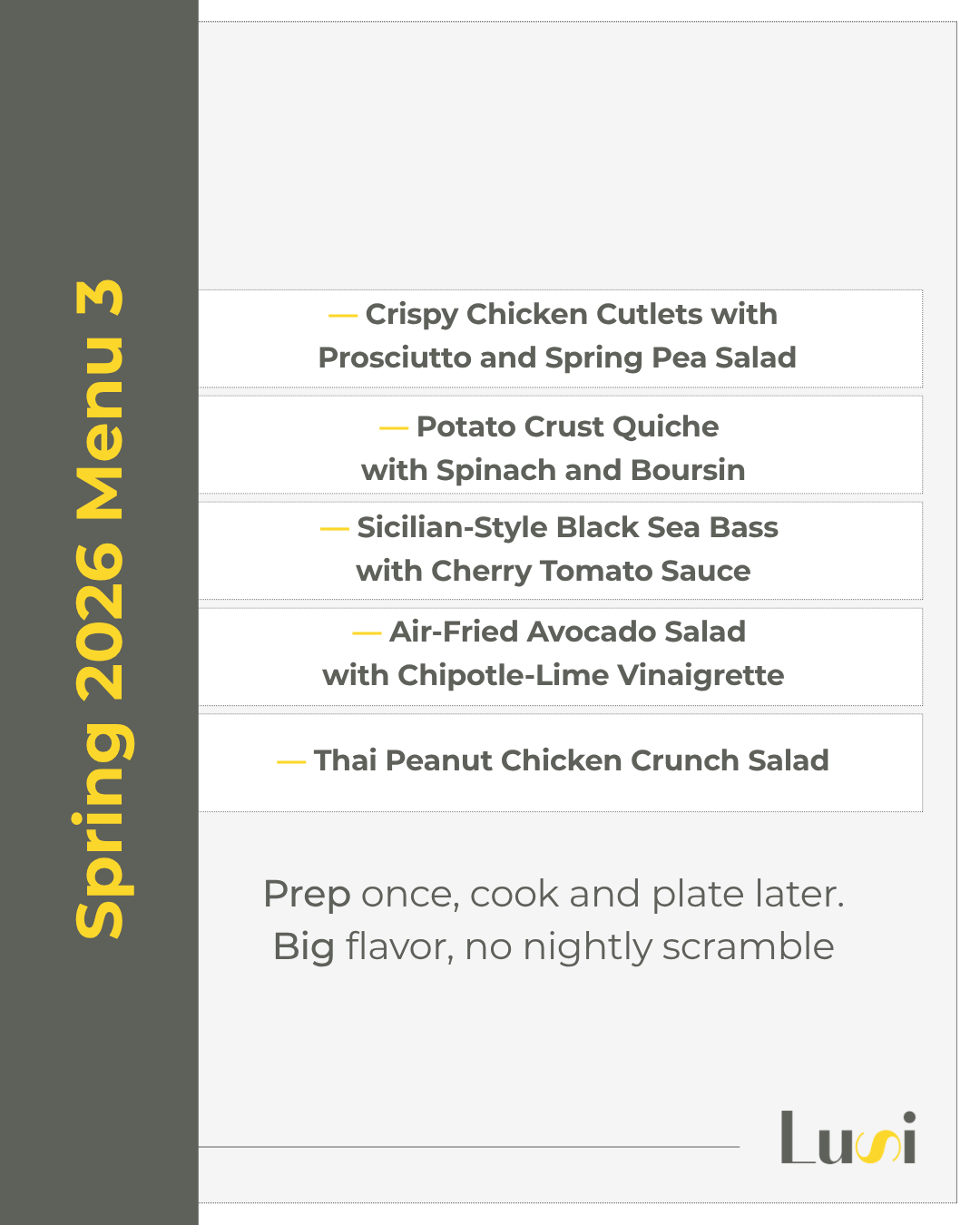 No last-minute scrambles. No wasted groceries. Just real food, balanced and bold with flavor. Each menu is built to help you save time, cut stress, and actually look forward to cooking again. Here’s one of the delicious options you’ll receive.