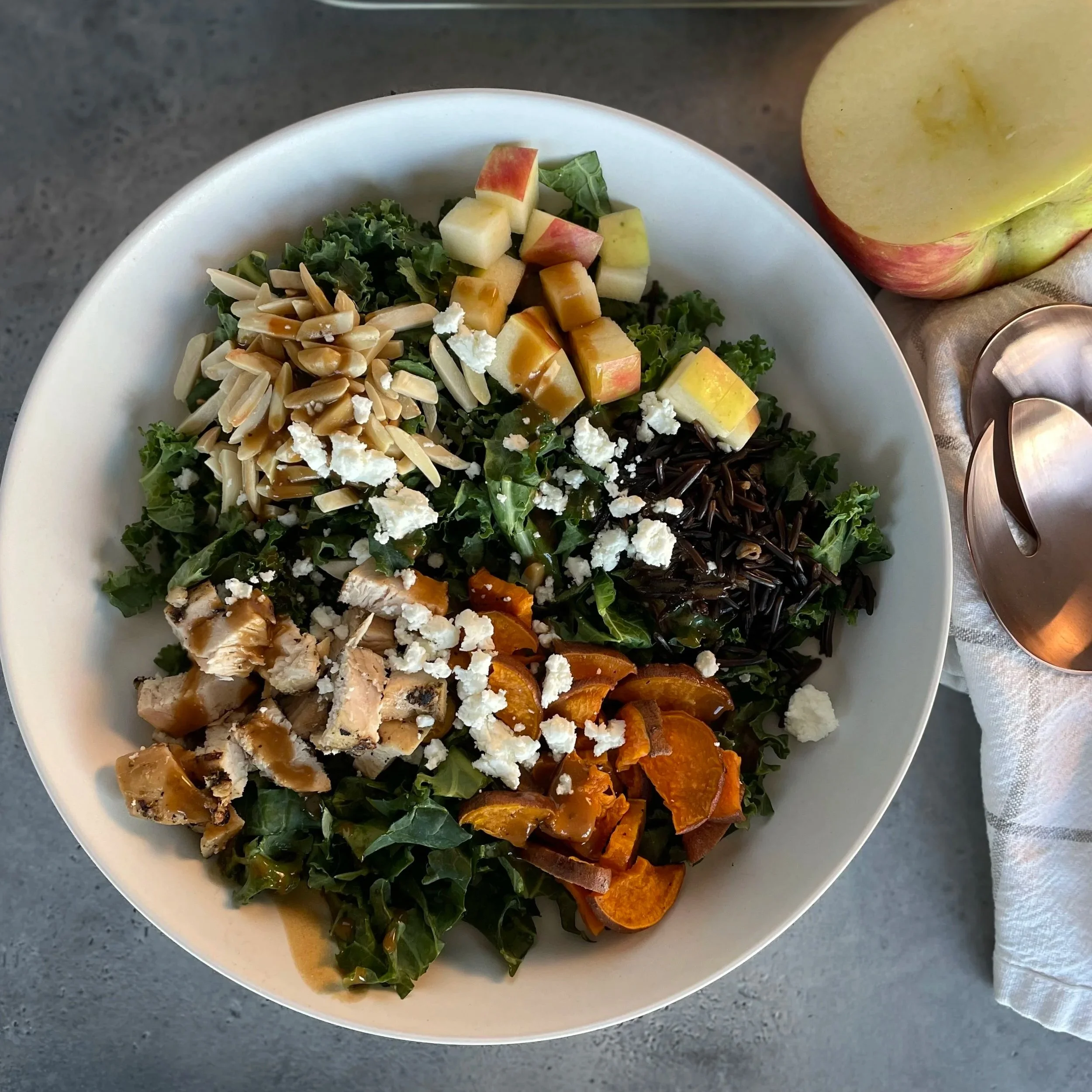 A hearty kale harvest salad with sweet potatoes, wild rice, chicken, apples, almonds, and goat cheese.