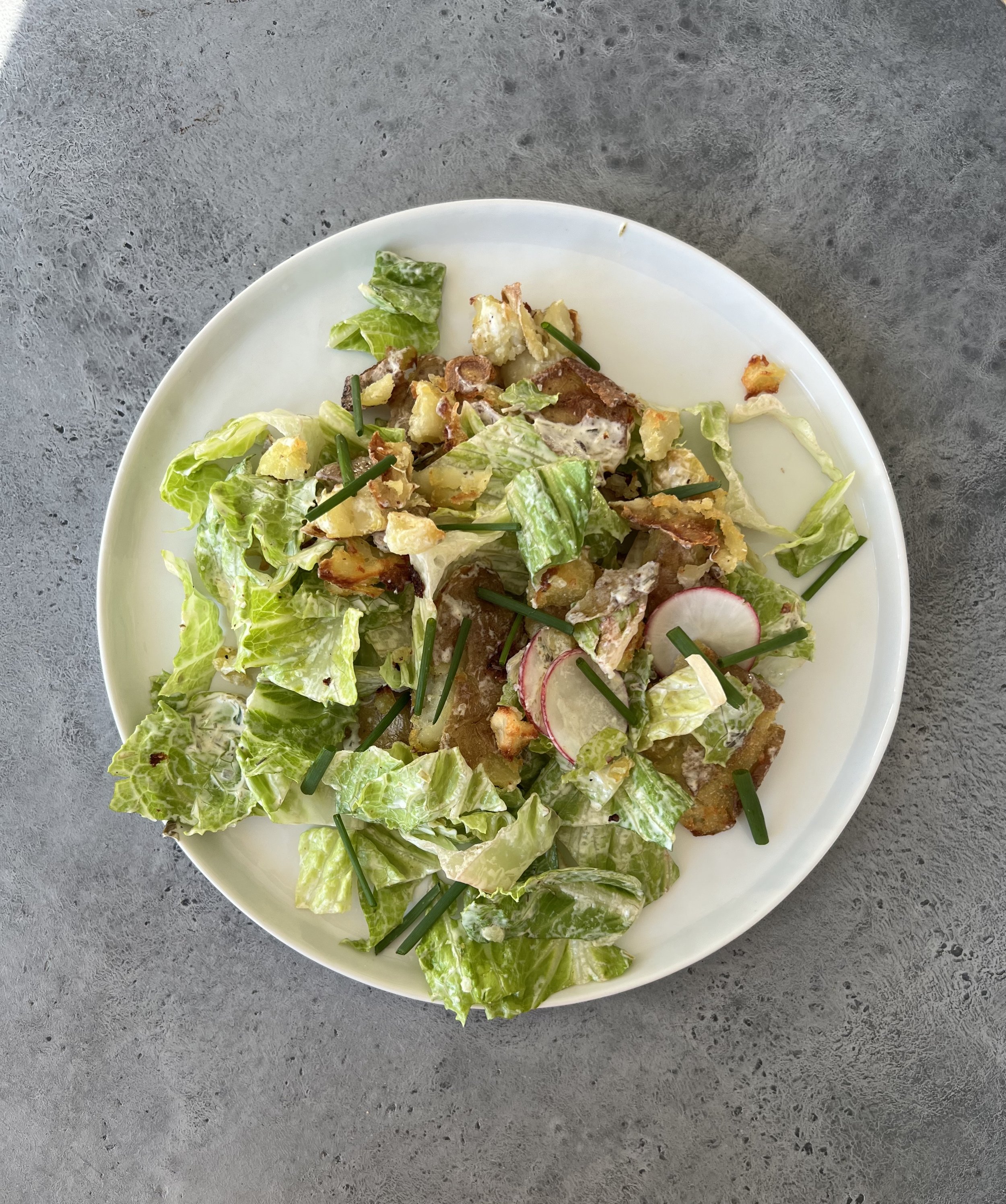 You know that feeling of opening a bag of sour cream and chive chips and not being able to stop? This is what this salad does to you. Crispy smashed potatoes with shattered edges, a thick and smoky charred scallion dressing that hits all the creamy tangy notes, fresh romaine, and radishes for snap. The kind of thing you make and dream about the next day.