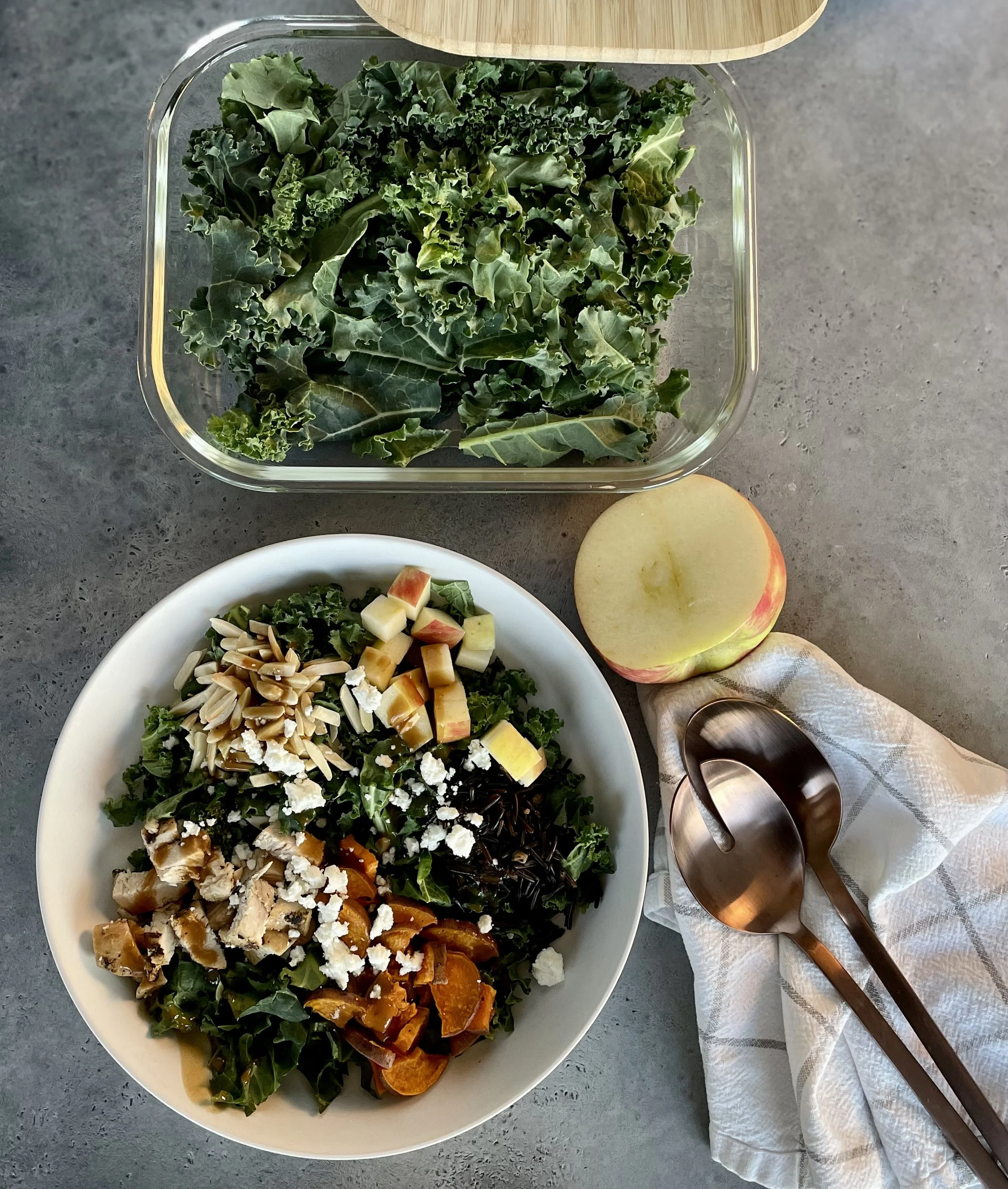 Plate: Add roasted sweet potatoes, diced apple, wild rice, chicken, and slivered almonds to the bowl. Toss with the dressing until evenly coated. Sprinkle crumbled goat cheese over the top before serving.