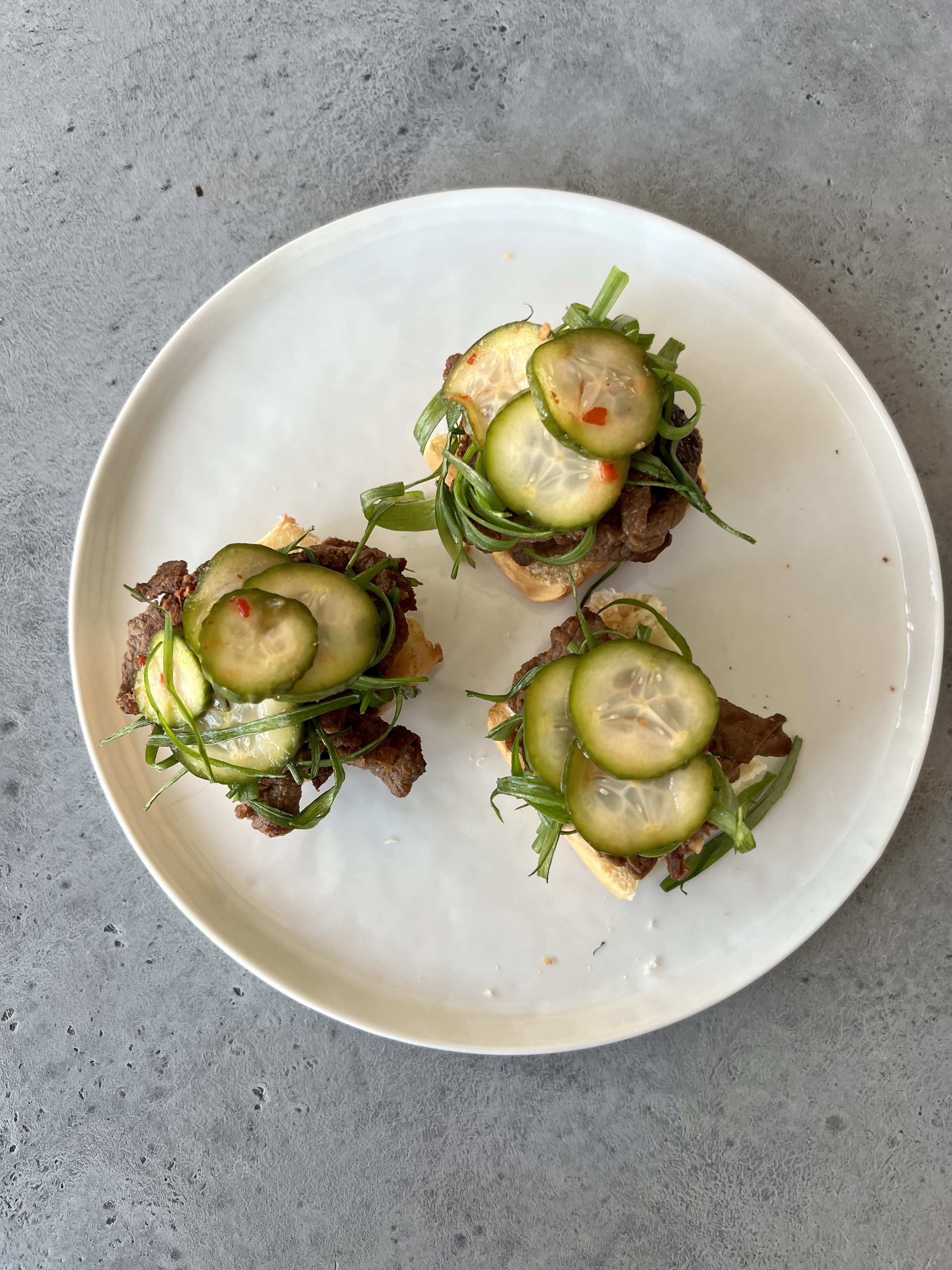 Plate: Lightly toast slider buns. Fill with beef, pickled cucumbers, and scallions, then spoon spicy mayo on top or serve on the side.